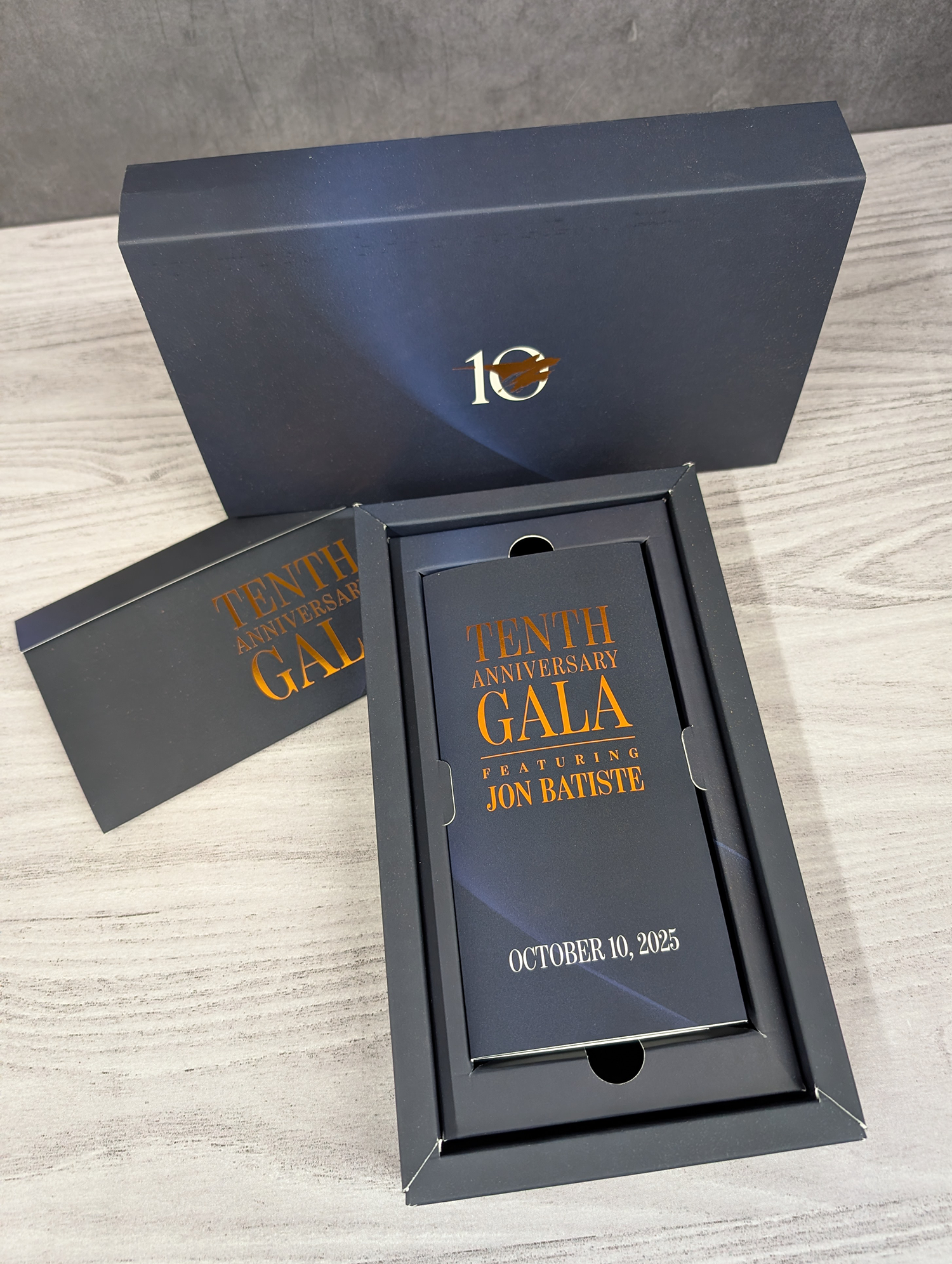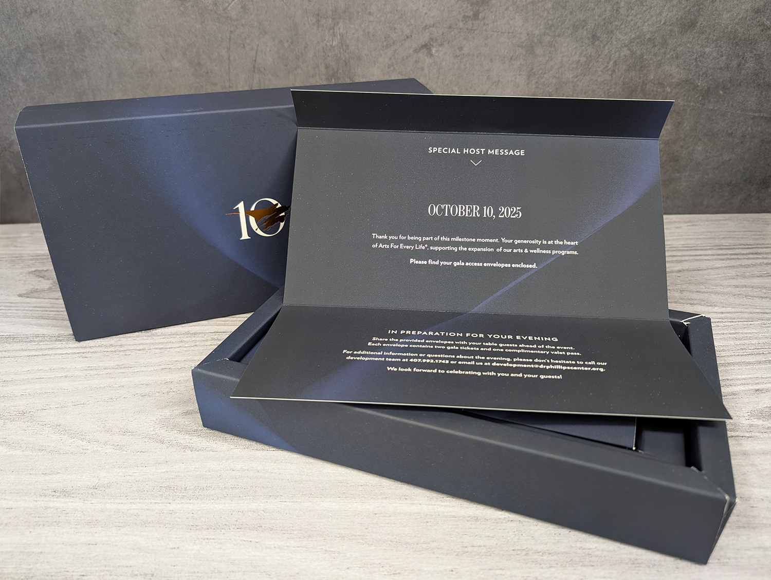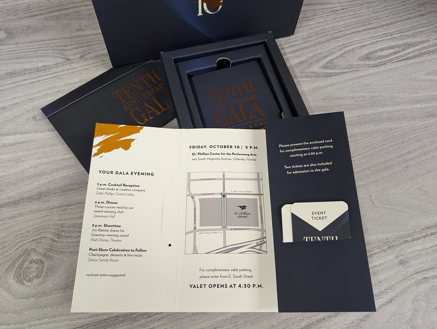 The front of the box presents with the Dr. Phillips Center signature Four Count symbol and iconic tenth anniversary logo highlighted with gold foil on an elegant navy blue background. Sliding it open reveals more gold foil and a special message for the table hosts, nestled in a custom-cut niche. All the components include a Soft Touch coating, showcasing a tactile luxury.
