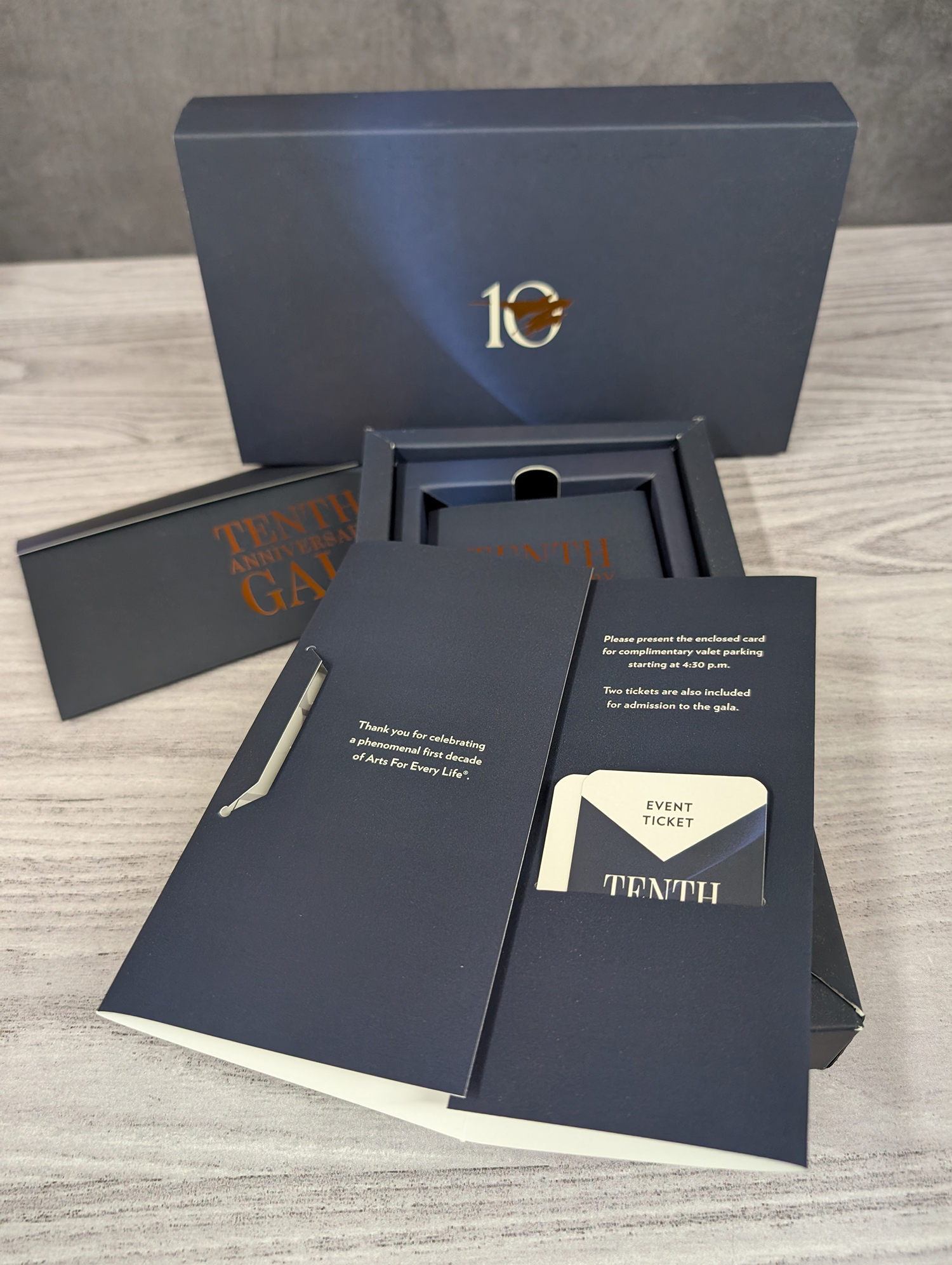 This is followed by four custom, gold-foiled envelopes that each contained two event tickets, a complimentary valet parking pass, and details about the event. SunDance was able to handle the variable data of different ticket and table numbers, thoughtfully packaged and discreetly temporarily labeled so they would be sure to be delivered to the correct recipient.